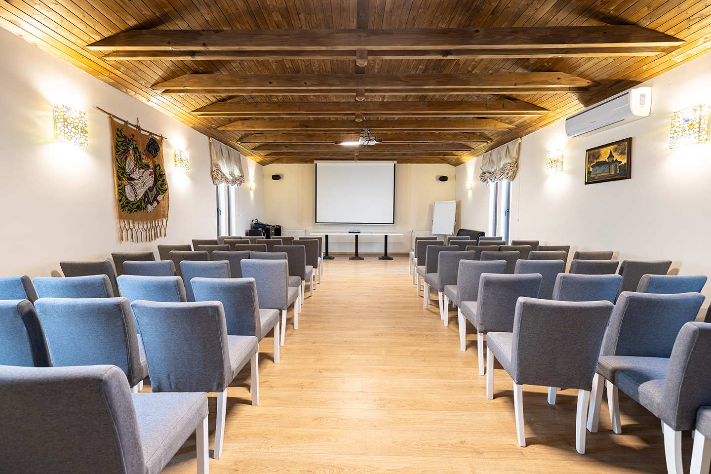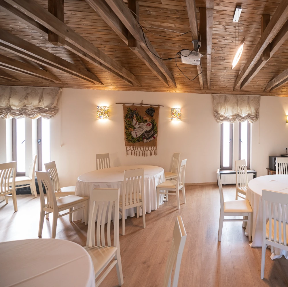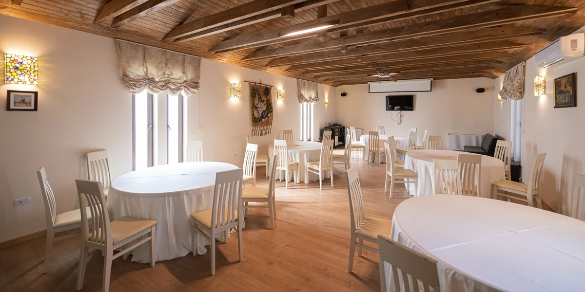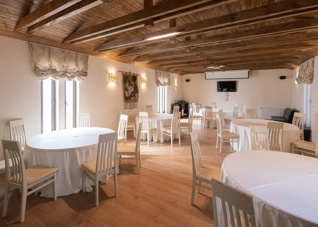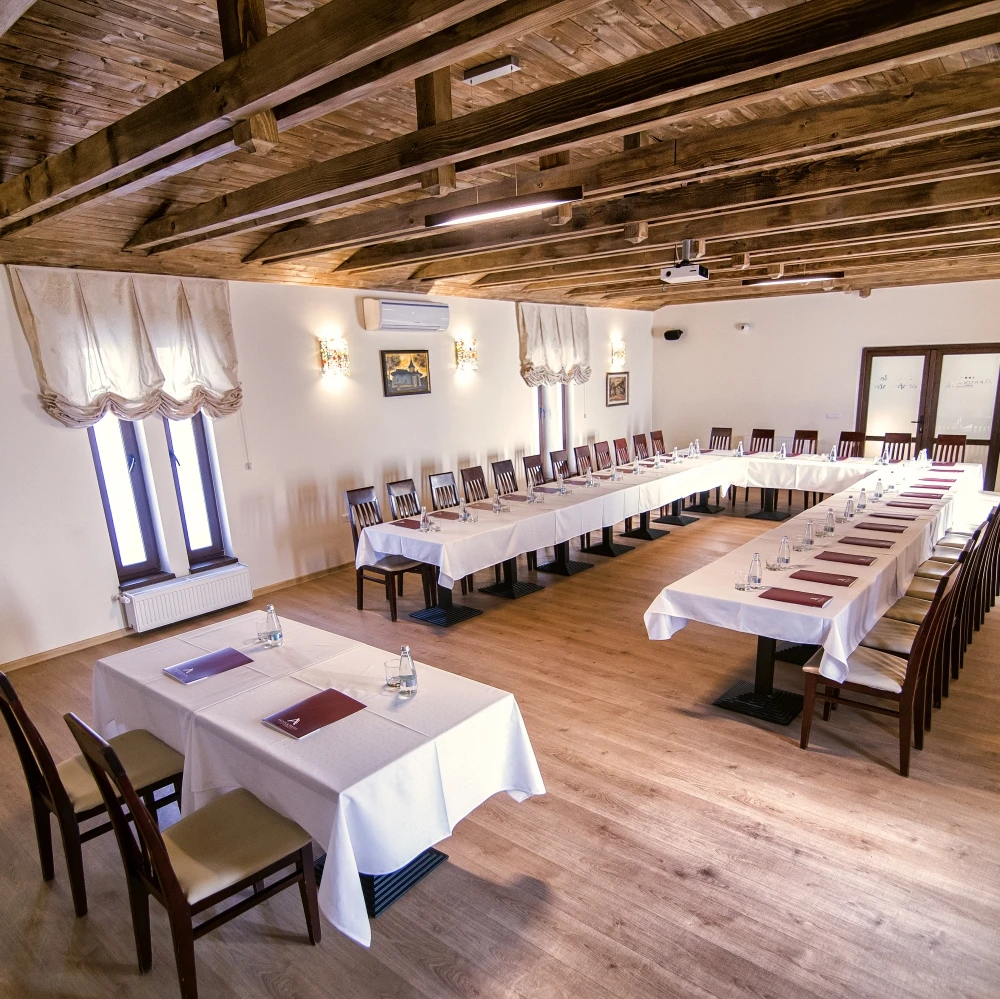 Pentru întâlniri, cursuri, seminare, training-uri sau team-building-uri te așteaptă o sală de conferințe modernă, dotată cu videoproiector, ecran de proiecție, sistem audio, flipchart, Wi-Fi, hârtie, markere, TV/LED, microfon mobil și aer condiționat. Capacitate: 80 de locuri în aranjament teatru, 50-60 de locuri în aranjament sală de clasă, 32 de locuri în aranjament U sau consiliu.